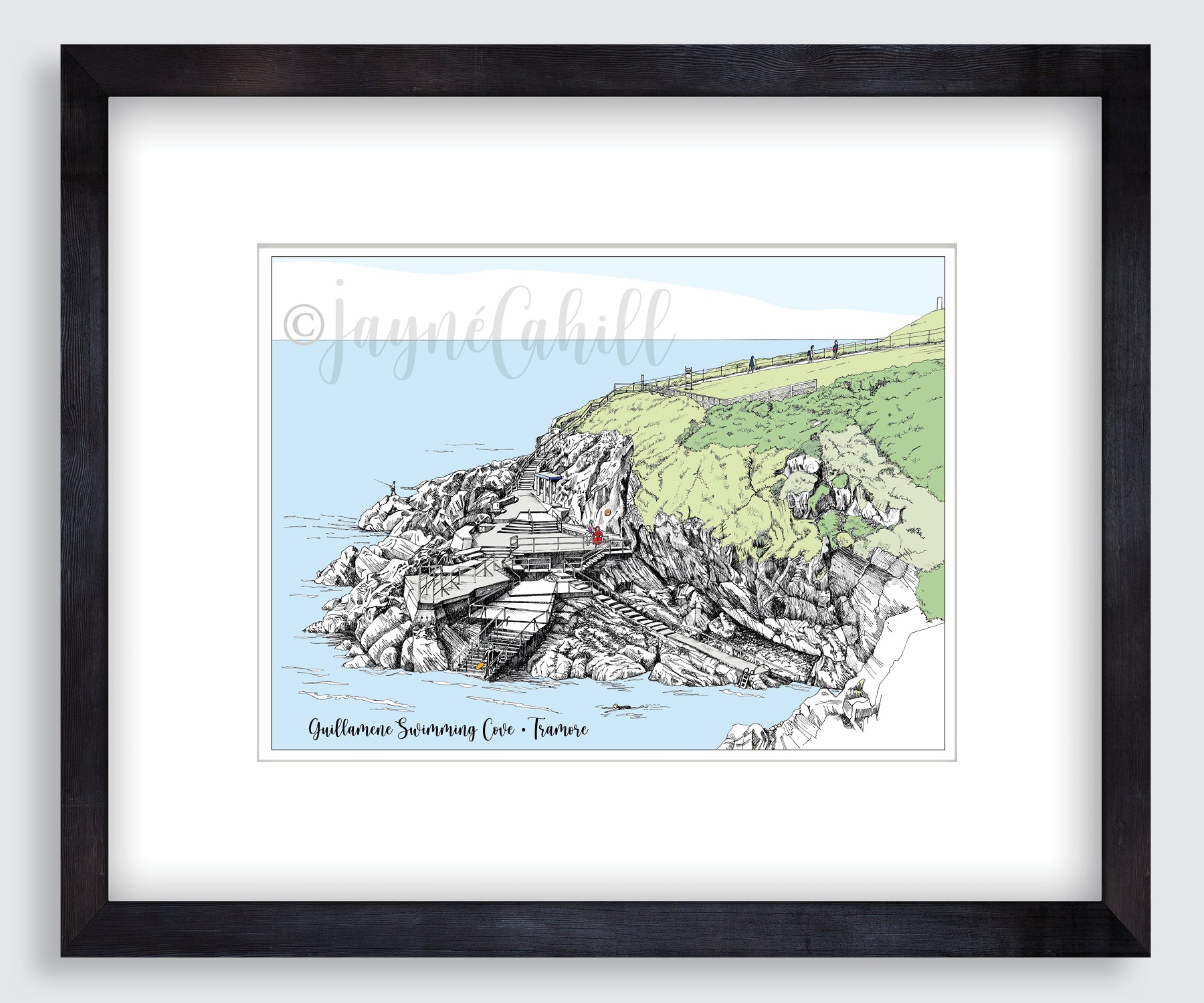 Limited edition signed print of original pen & ink drawing of Guillamene Swimming Cove at Newtown, Tramore, Co. Waterford, by artist Jayné Cahill.