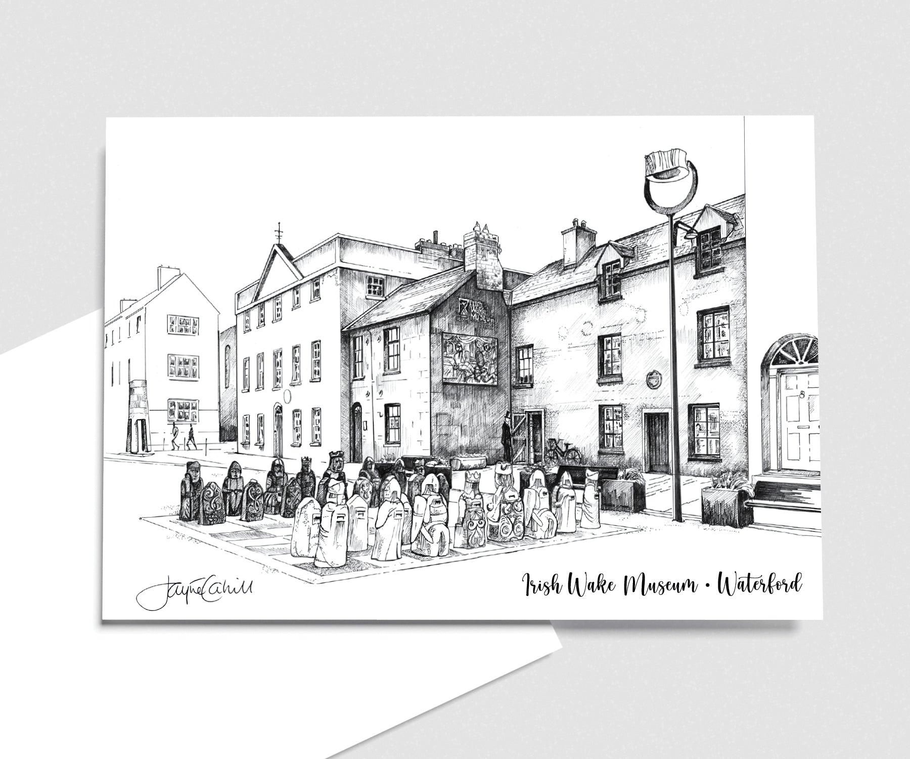Art card of Irish Wake Museum, Waterford from an original drawing by Jayné Cahill. Blank inside for your note or greeting.