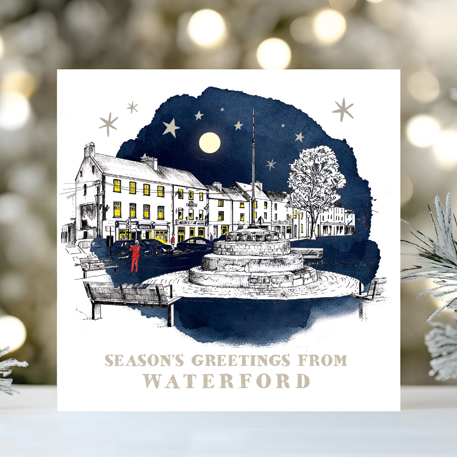 Send seasons greetings with this Jayné Cahill Christmas Card showing the Bull Post in Waterford.
