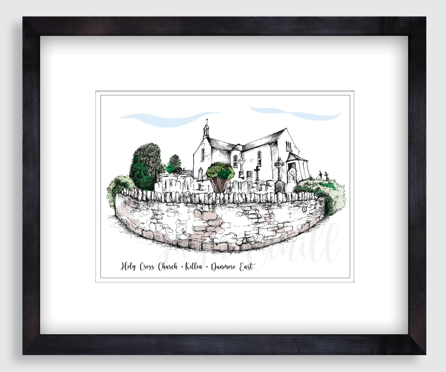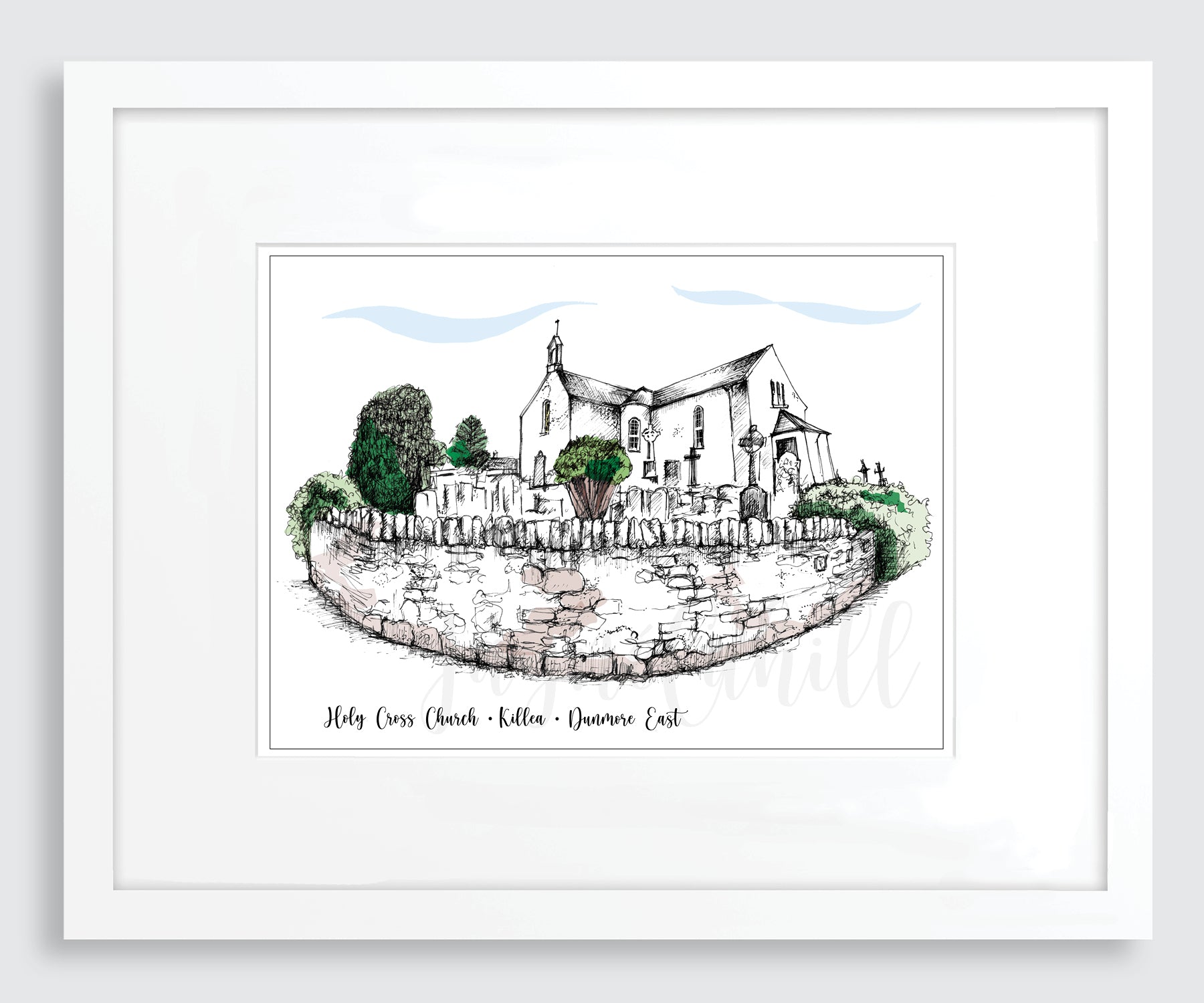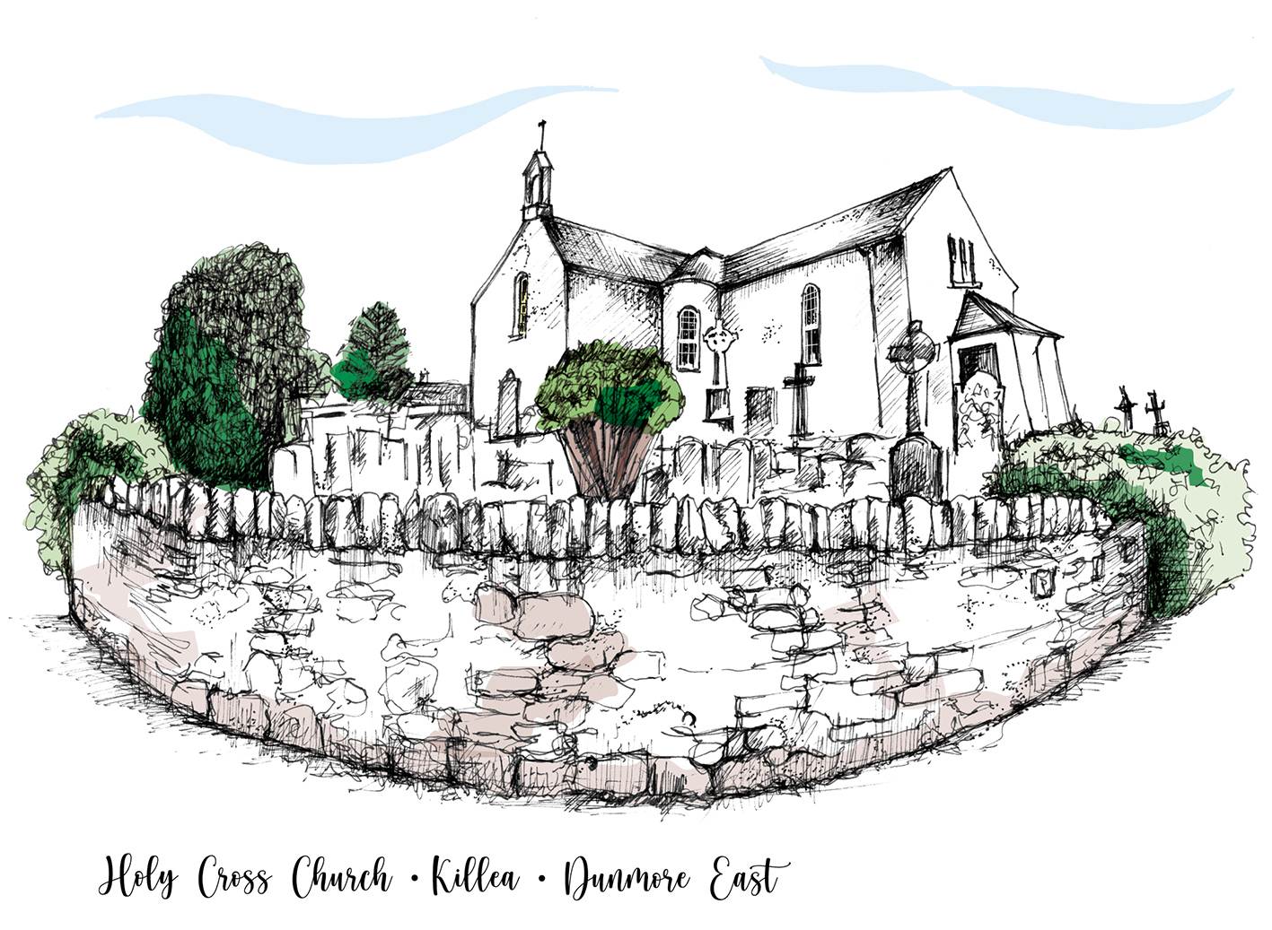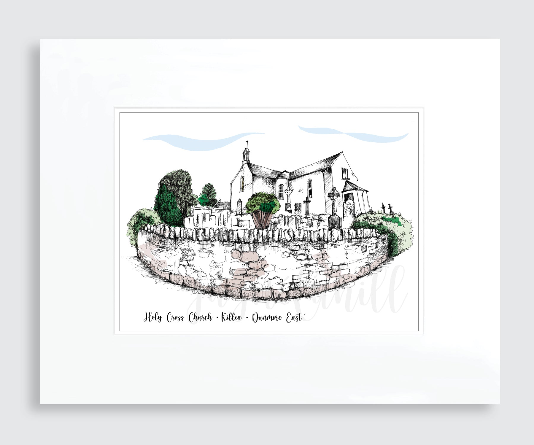 Limited edition signed print of original pen & ink drawing of the Holy Cross Church, Killea, Dunmore East Co. Waterford, Ireland, by artist Jayné Cahill.