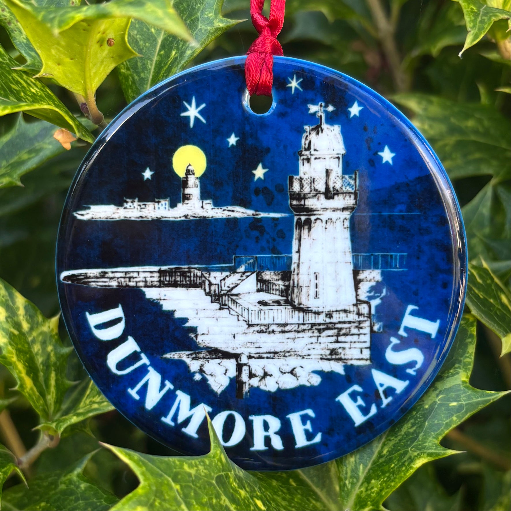 Capture the spirit of Ireland's coast with this ceramic Christmas decoration featuring the lighthouses of Dunmore East and Hook. Hand-printed in Dunmore East and finished in an organza gift bag, it's a perfect keepsake for sea lovers and a thoughtful gift for friends living abroad.
