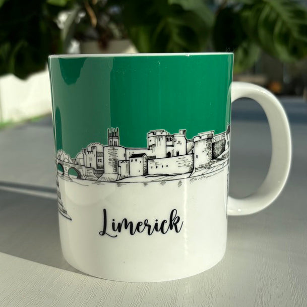 Celebrate Limerick with this vibrant Jayné Cahill Art mug, featuring hand-drawn illustrations of the city's most iconic landmarks — including the Treaty Stone, Thomond Park, St Mary's Cathedral, St John's Cathedral, Thomond Bridge, King John's Castle, and the People's Park Drinking Fountain. A perfect keepsake or gift for any Shannonsider.
