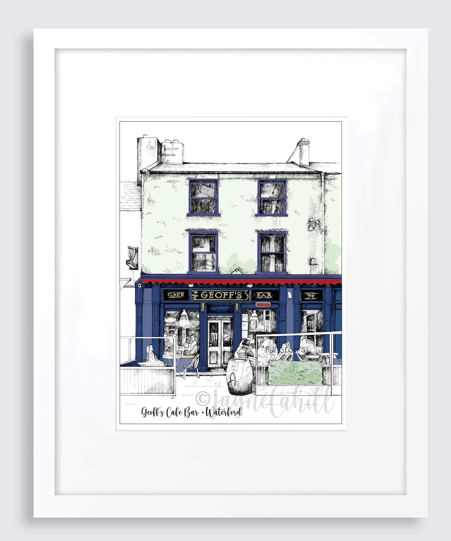 Limited edition signed print of original pen & ink drawing of the iconic Geoff's Cafe Bar in Waterford, Ireland, by artist Jayné Cahill.