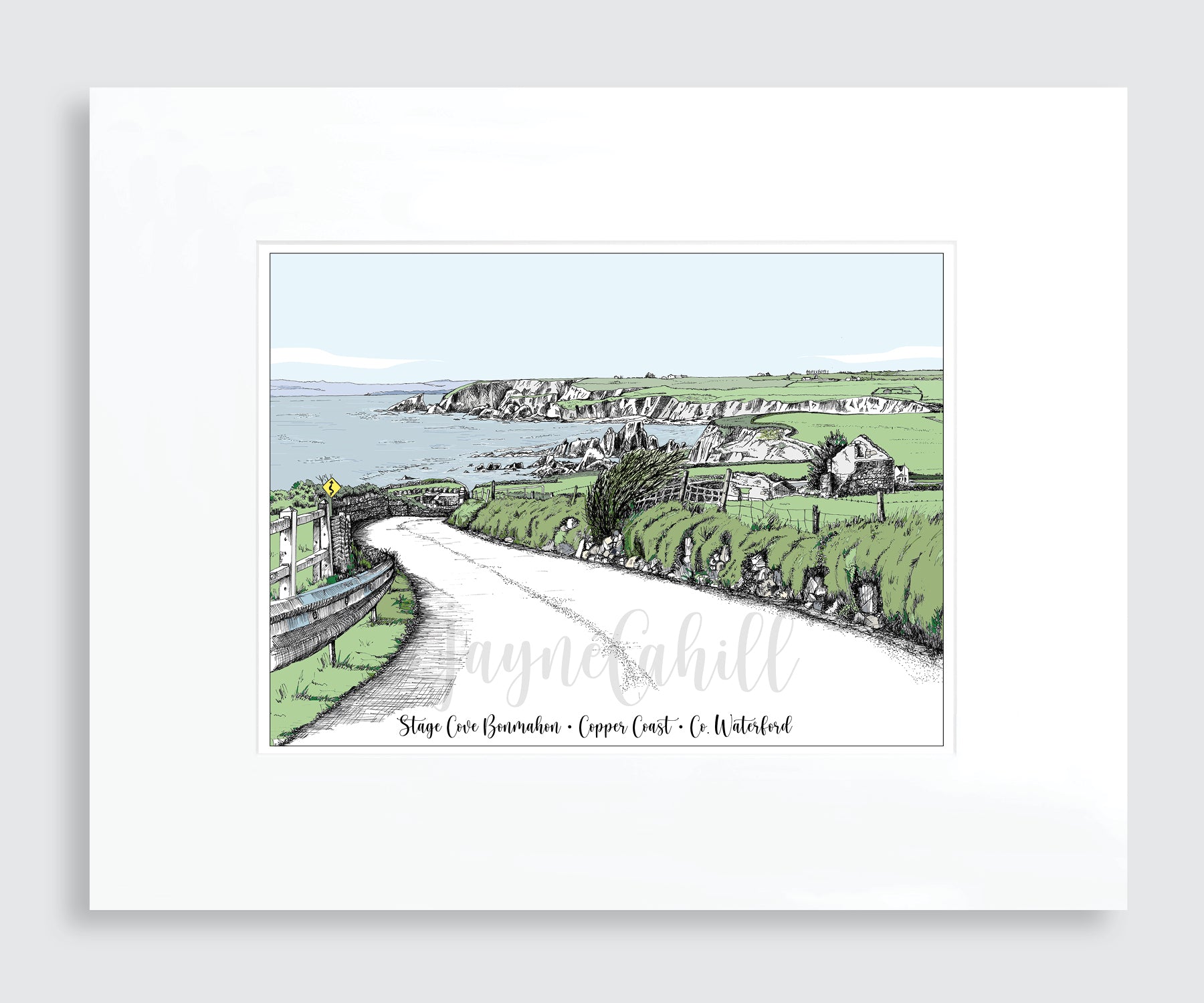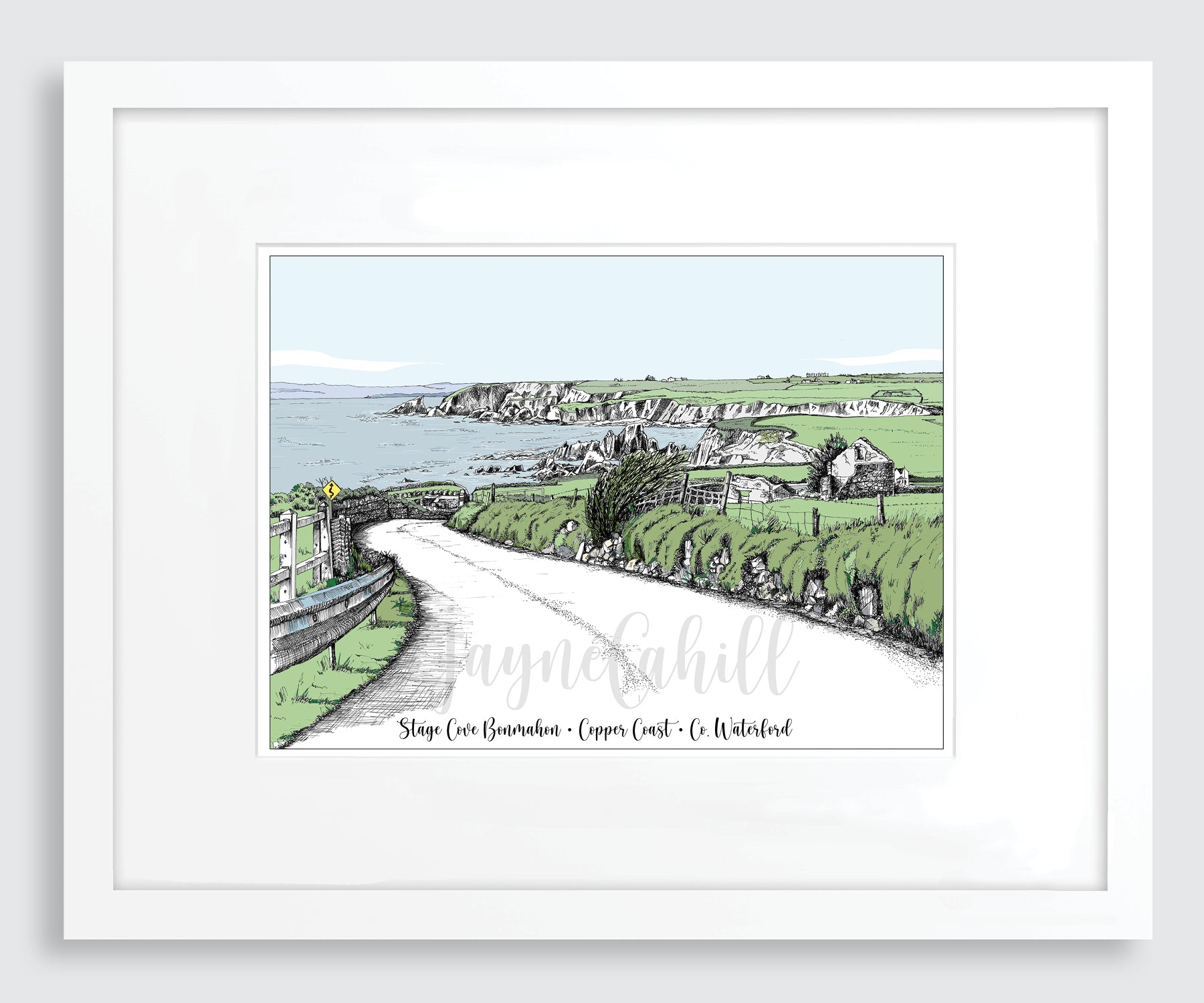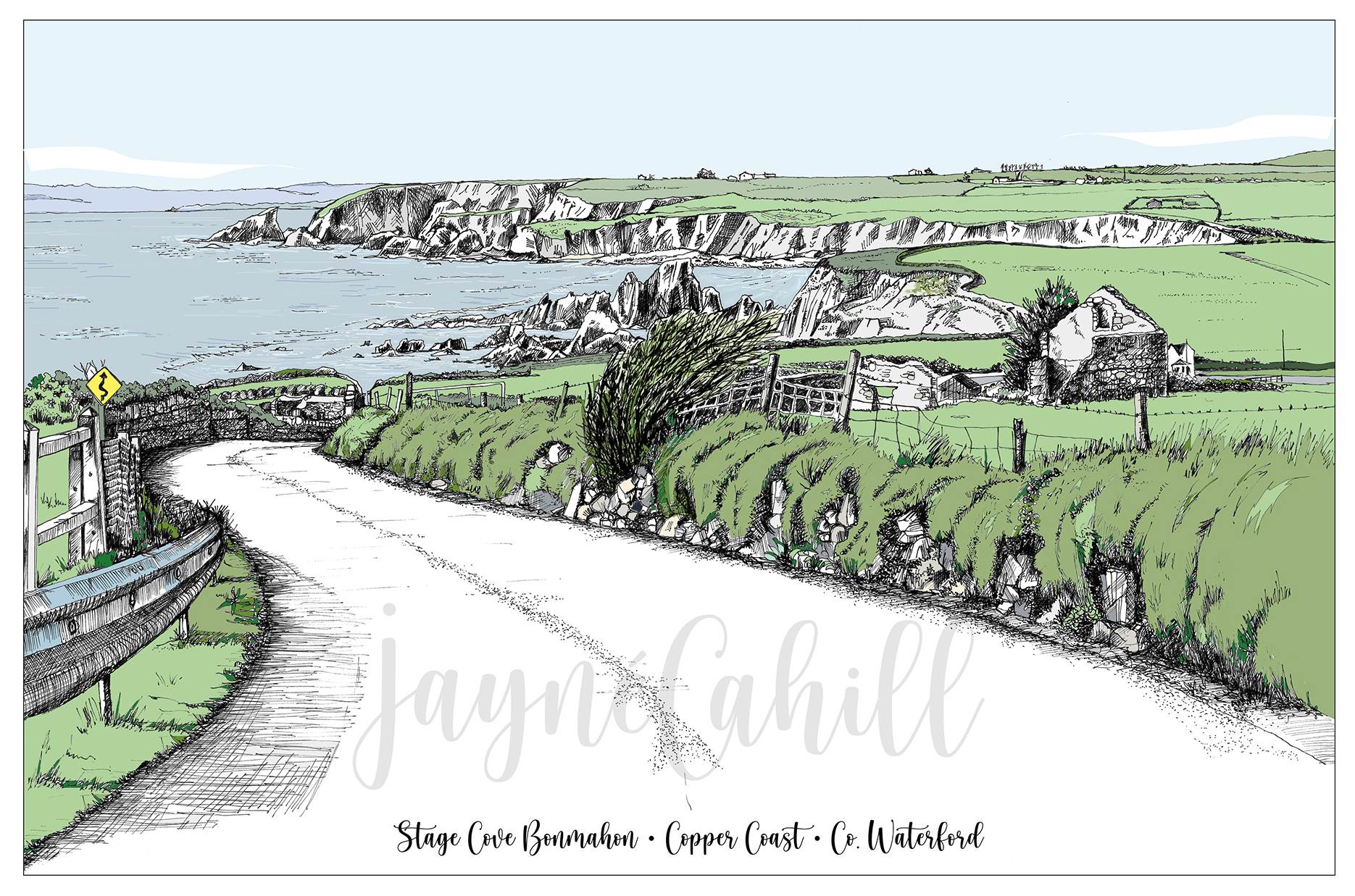 Limited edition signed print of original pen & ink drawing of the view over Stage Cove Bunmahon, on the Copper Coast, Co. Waterford, by artist Jayné Cahill.